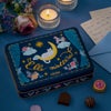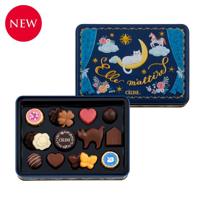 三日月に乗った猫を描いた幻想的なネイビーの缶パッケージに、ハートやバラ、猫の形のチョコレートなど色とりどりのチョコレートを詰め合わせました。フルーツやナッツ、はちみつなど味のバラエティも豊か。缶パッケージは、リユースしたくなる可愛さ。【お酒不使用】※ハニーキャラメルトリュフには、はちみつが含まれています。1歳未満の乳児には与えないでください。