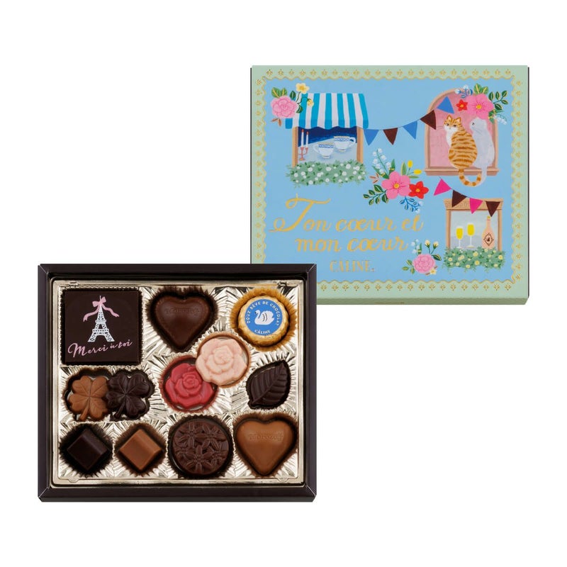 バラやクローバーなど様々な形のチョコレートをボリュームたっぷりに詰め合わせました。定番のミルク、エキストラミルク、セミスイートの味わいに加え、ポイントにストロベリーとカシスの味わいも。2匹の猫が描かれたブルーとグリーンの爽やかなパッケージです。【お酒不使用】