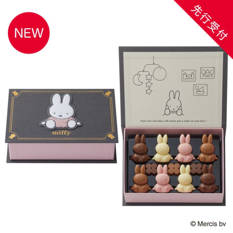 ミッフィーと一緒に、ひと休み。ちょこんとお座りした、愛らしいミッフィーのかたちのチョコレートをふわふわワッペンが付いた、布貼りボックスにずらりとアソート。スイートなリラックスタイムをお過ごしください。【お酒不使用】