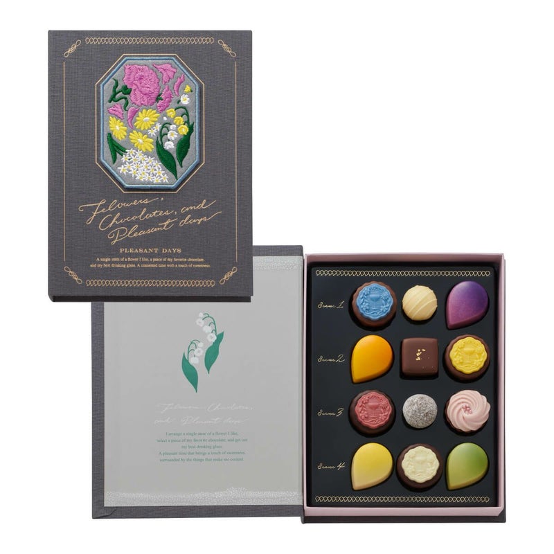 こころに残る4つの情景を書き留めた、アルバムのようなチョコレートボックス。表紙には、可憐なお花の刺繍をほどこして。ここちよい時間を思い描きながら一粒ずつ大切に味わいたい。