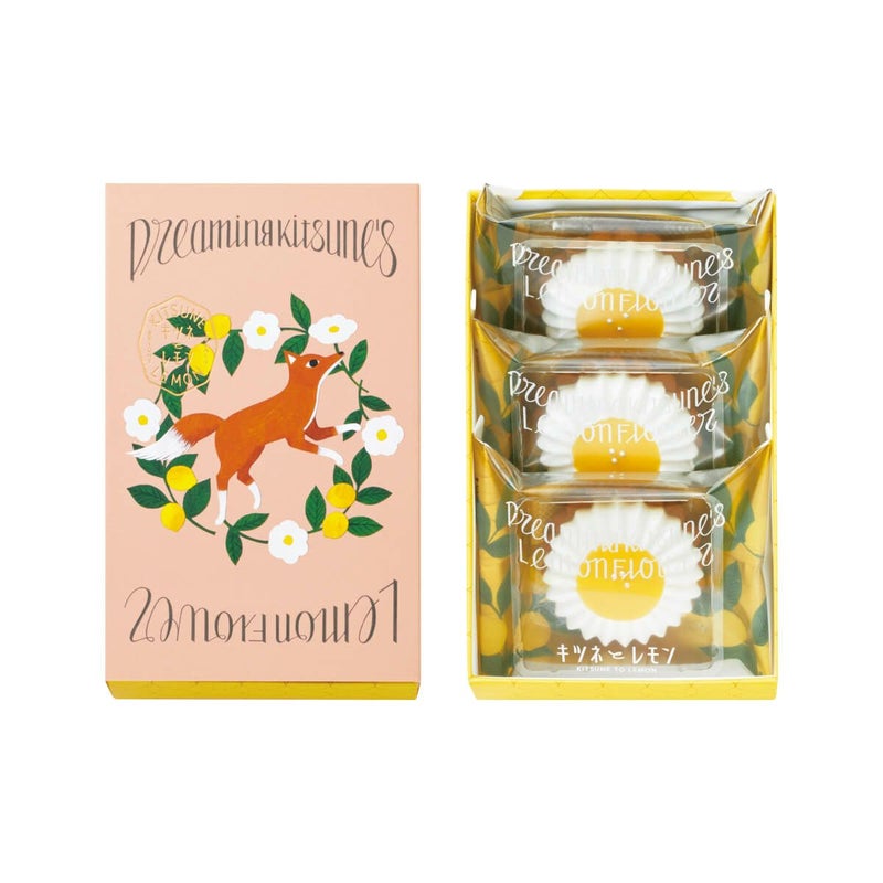 「キツネが夢で見た、レモンのお花。きらきら光るその雫を花びらのメレンゲレースでそっと包んだらきゅんとくるお菓子の出来上がり。」さくさくのバタークッキーの上に、軽やかなメレンゲクッキーで甘酸っぱいレモンクリームを閉じ込めました。