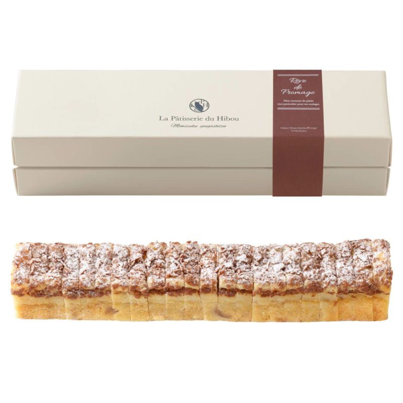 季節を感じる贅沢なチーズケーキ「レーヴ・ドゥ・フロマージュ〜デセール・ドゥ・セゾン〜」シリーズ。フランス産生乳を100%使用したクリームチーズに、「マロン」を組み合わせました。フレッシュでクリーミーな味わいのクリームチーズが、上品な甘さのマロンを引き立てます。粉糖をトッピングし、モンブランのように華やかに仕上げた、秋冬限定のレーヴ・ドゥ・フロマージュ。くちどけなめらかで軽やかな口当たりのクリームチーズケーキは、一切れで堪能できるよう、定番のレーヴ・ドゥ・フロマージュより少し厚みのある"約10mm"にカットしてお届けします。厚みの中に詰まった素材とクリームチーズのおいしさをお楽しみください。みみずく洋菓子店 レーヴ・ドゥ・フロマージュ(マロン) 商品紹介ページはこちら