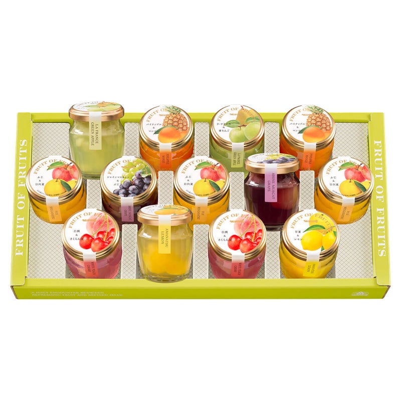 繊細なフルーツゼリーの中に、みずみずしい国産果実を閉じ込めて。果肉とゼリーの2種のフルーツが織りなす贅沢な果実のマリアージュが、夏を彩る上品なおいしさです。オリジナルの新しいガラス容器は、ギフトシーンを美しく演出します。