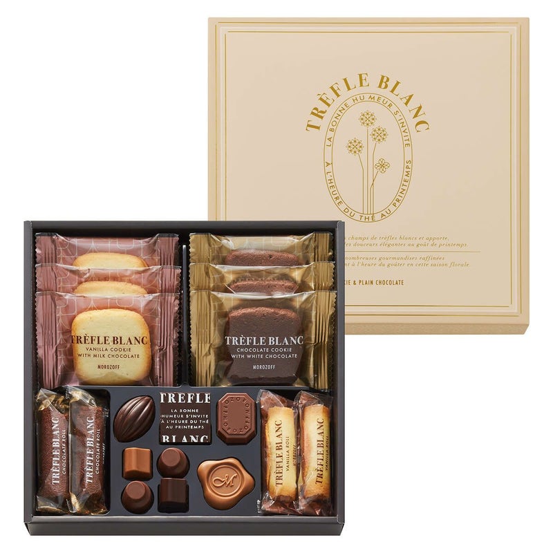 上質感と気品を兼ね備えたベージュのボックスにミルク、ホワイトチョコレートをサンドしたラングドシャクッキーとかろやかな食感のロールクッキーを詰め合わせて。さらに、3種のプレーンチョコレートをアソートした味わいのバラエティが多彩で嬉しい一品。【お酒不使用】