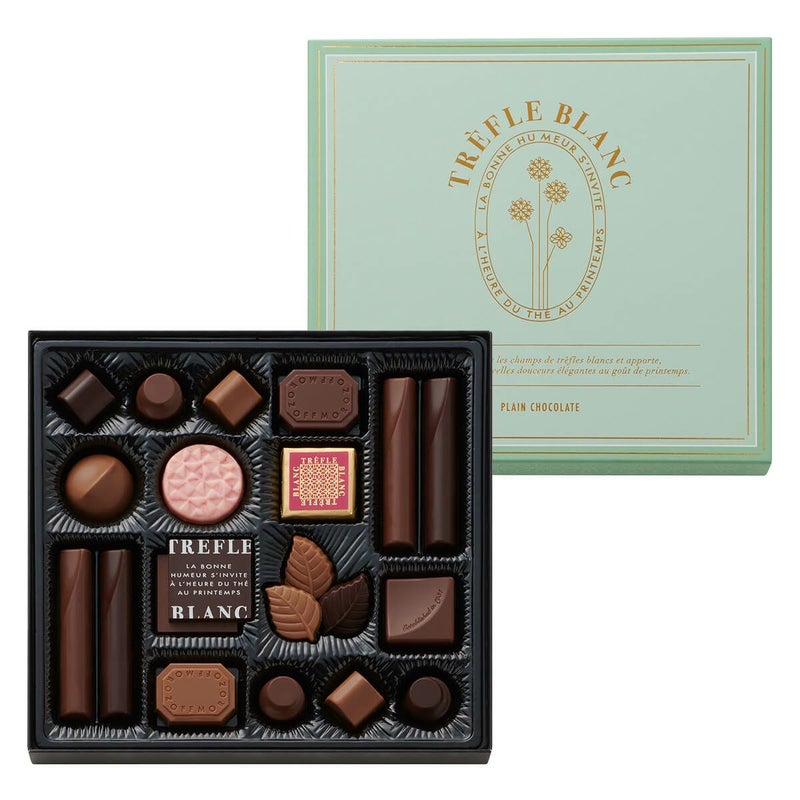 爽やかなライトグリーンのボックスにスイート、ミルク、エキストラミルクなど、なめらかな口どけのチョコレートをボリューム感たっぷりにアソート。春の訪れを感じるピンクのストロベリーチョコレートがアクセントに。【お酒不使用】