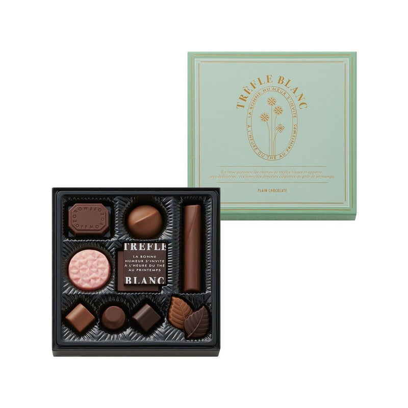 爽やかなライトグリーンのボックスにスイート、ミルク、エキストラミルクなど、なめらかな口どけのチョコレートをボリューム感たっぷりにアソート。春の訪れを感じるピンクのストロベリーチョコレートがアクセントに。【お酒不使用】