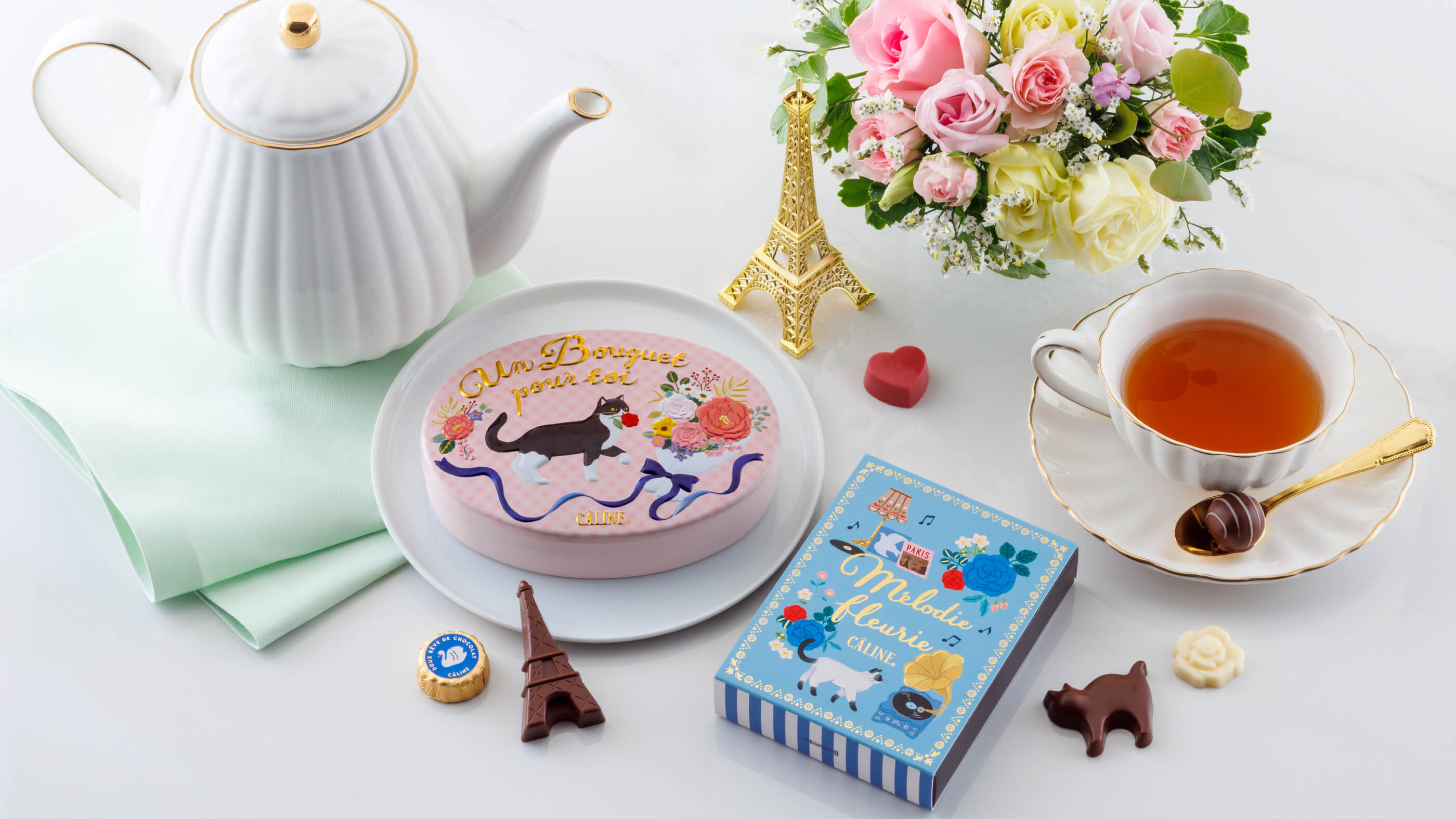 猫やエッフェル塔、バラなどキュートな形のチョコレートを詰め合わせました。