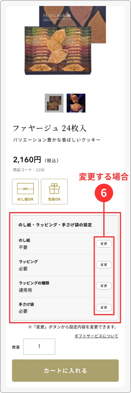 ご注文される商品ページにて、のし紙・包装・手さげ袋の設定ができます。